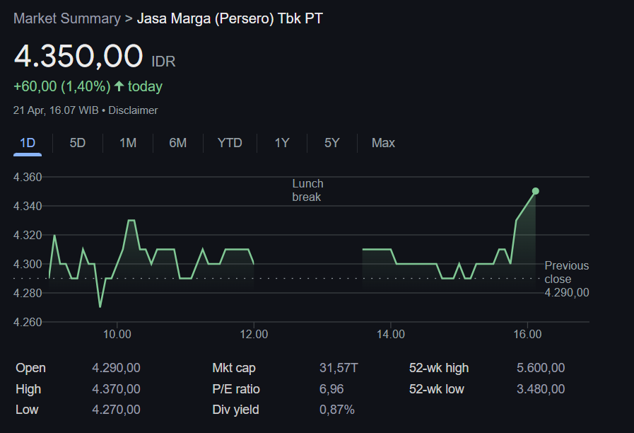 - Buy JSMR (Current Price: 4.290, Entry: 4.290, Target Price: 4.590 (6,99%), Stop Loss: 4.150 (-3,26%) dan Risk to Reward Ratio: 1:2,1). JSMR ditutup membentuk candlestick marubozu kuat sebesar 5,93% pada akhir pekan lalu. JSMR terkonfirmasi telah berbalik arah dari downtrend menjadi uptrend yang tercermin dari candlestick yang sudah breakout dari garis EMA 5, 20, dan 50. Volume transaksi JSMR pada pekan lalu masih cukup kuat untuk melanjutkan penguatannya.