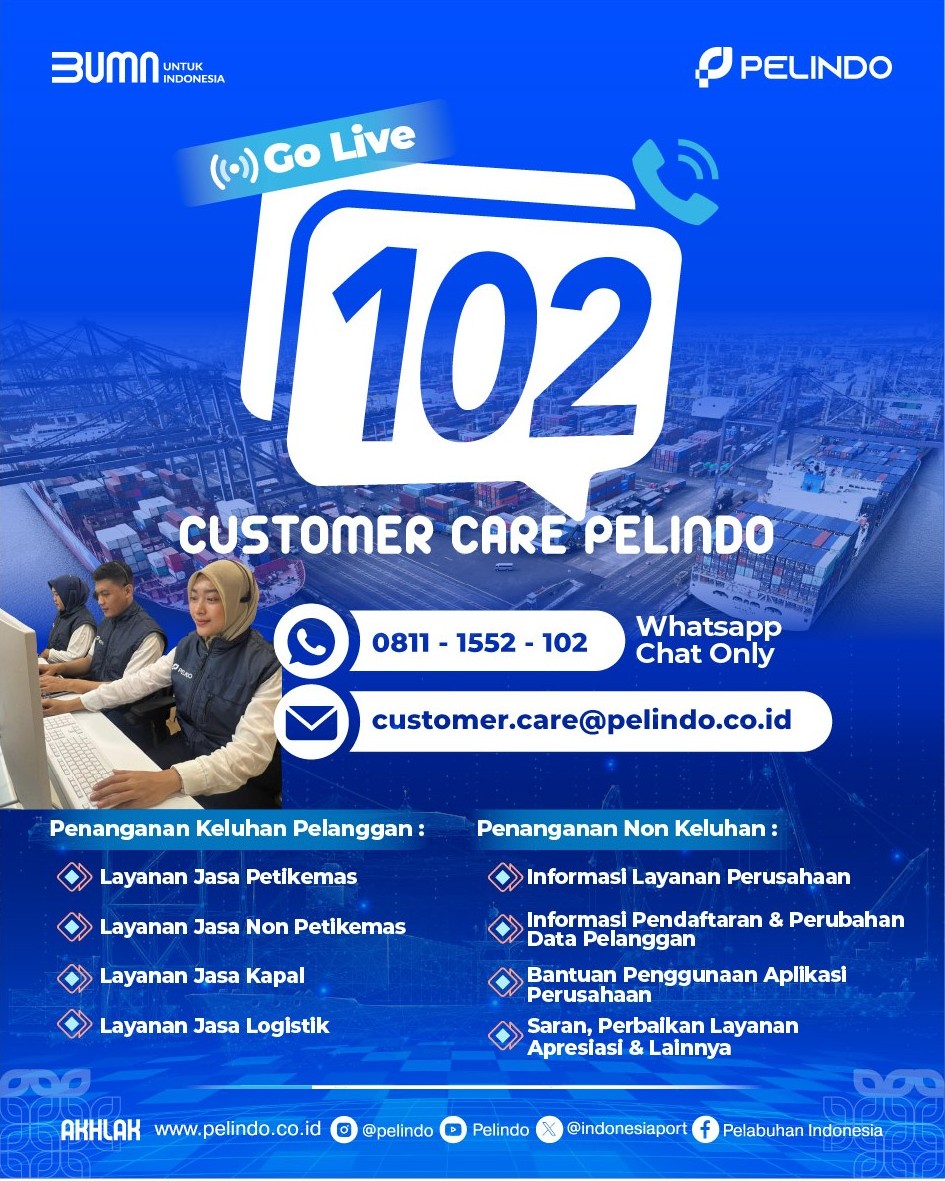 Peluncuran Customer Care Pelindo 102 ini diresmikan oleh Direktur Utama Pelindo, Arif Suhartono pada hari Rabu (21/05) di Pelabuhan Tanjung Priok. Customer Care dapat diakses melalui nomor telepon 102, Chat Whatsapp 0811-1552-102, dan Email customer.care@pelindo.co.id.